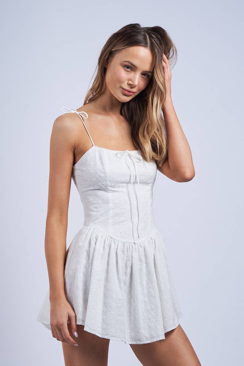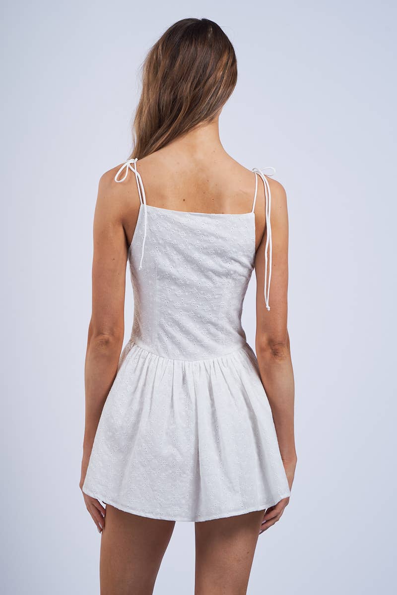 WHITE EYELET TIE STRAP FIT & FLARE MINI DRESS