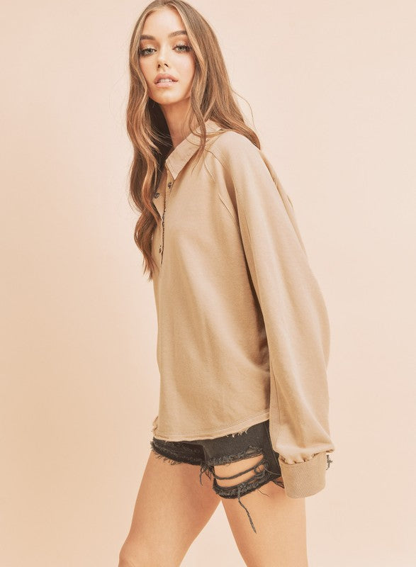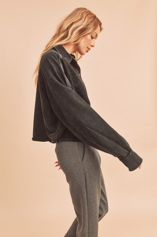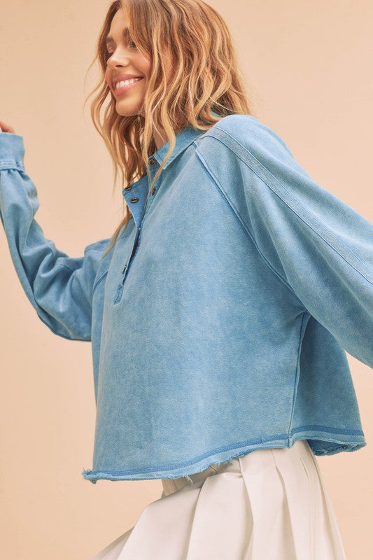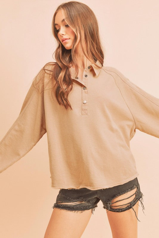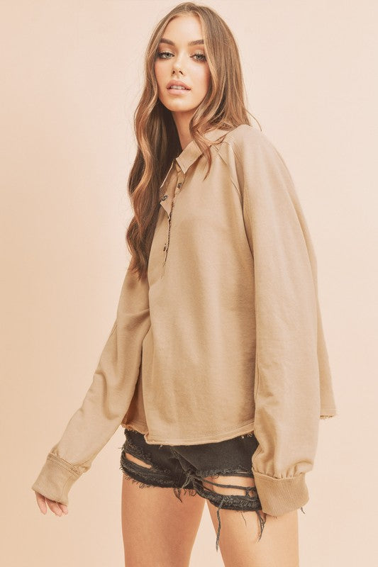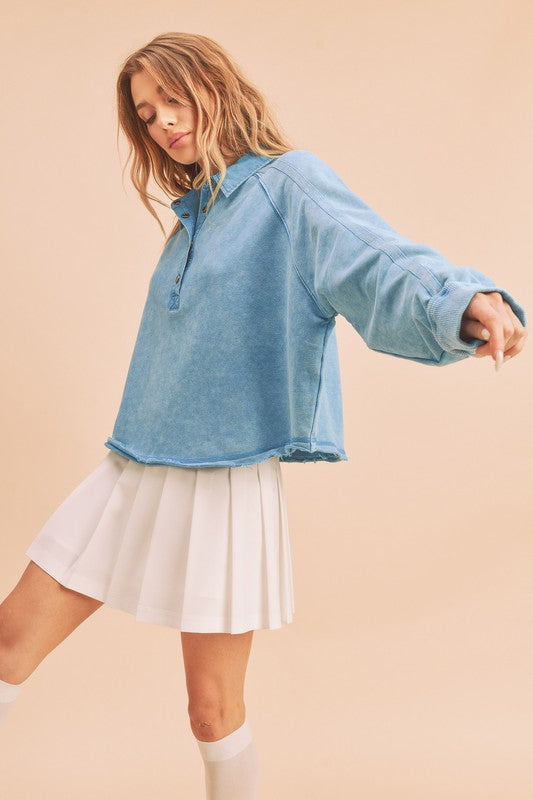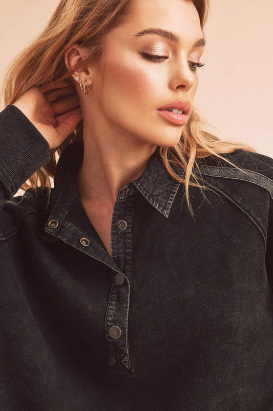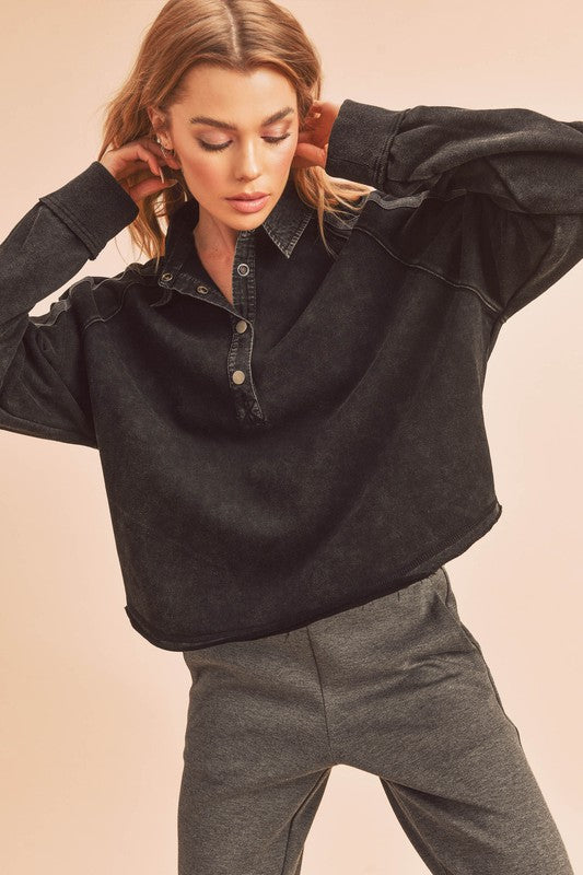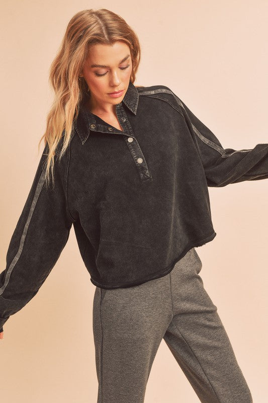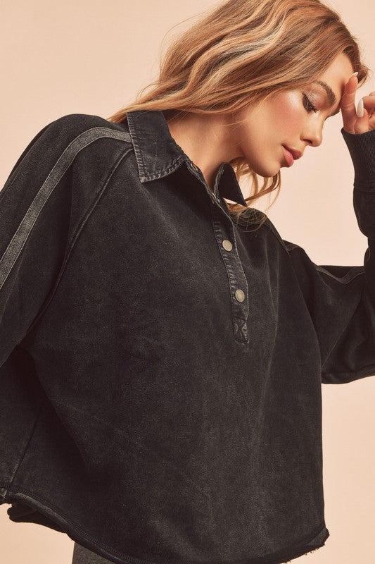 Sidni is the ultimate sporty pullover is featured in a cropped design with contrasting stripe on sleeve and collared, snap button collared neckline and slouchy raglan sleeves.